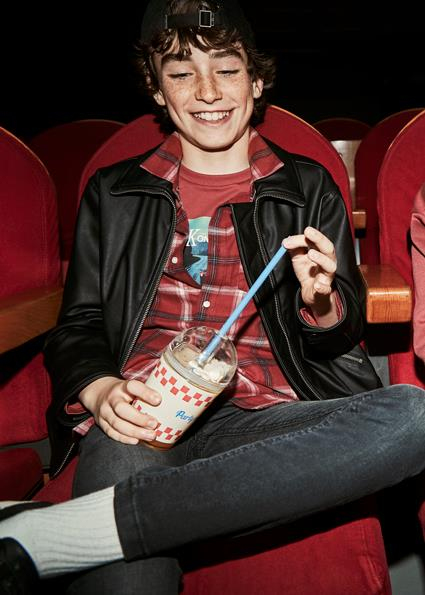 Erkek çocuk ceketi. Gömlek yakası. Önden fermuarlı. Modern suni deri dış yüzey. Fermuarlı cepler.